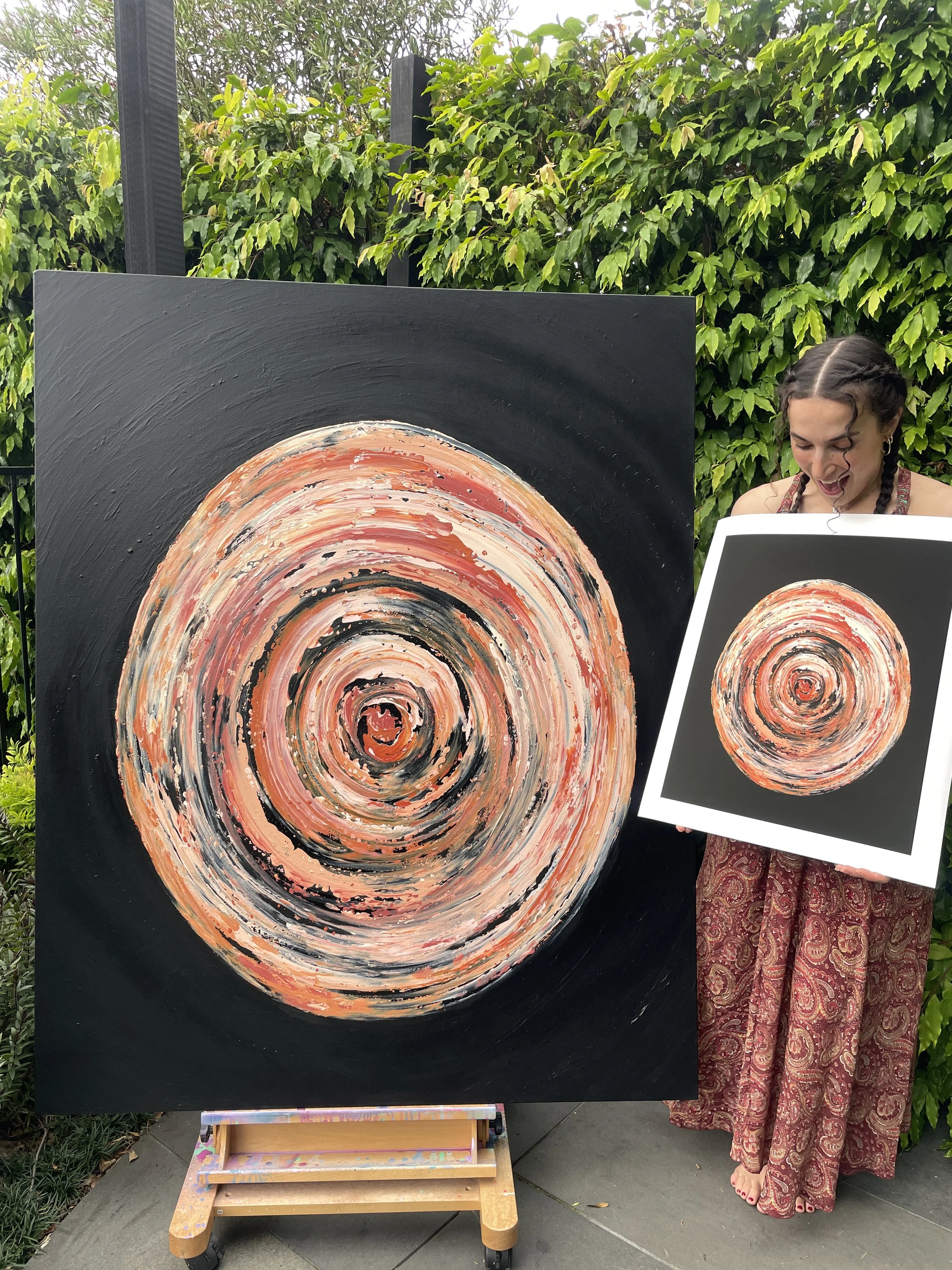 "Primal Mother" is a celebration of what it means to be a woman—our power, our resilience, and the infinite creativity that flows through us. At its centre is the womb, the cradle of life. This piece honours the physical and spiritual energy alive in every woman. Painting entirely with my hands made this work feel deeply personal—it’s raw, real, and instinctive and embodied.