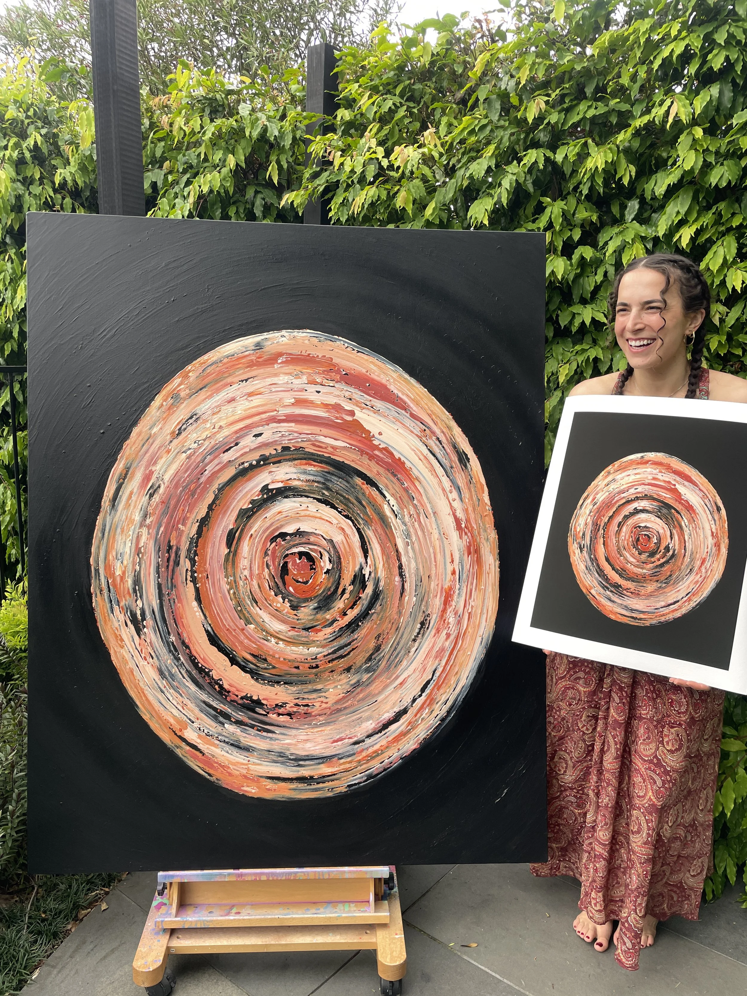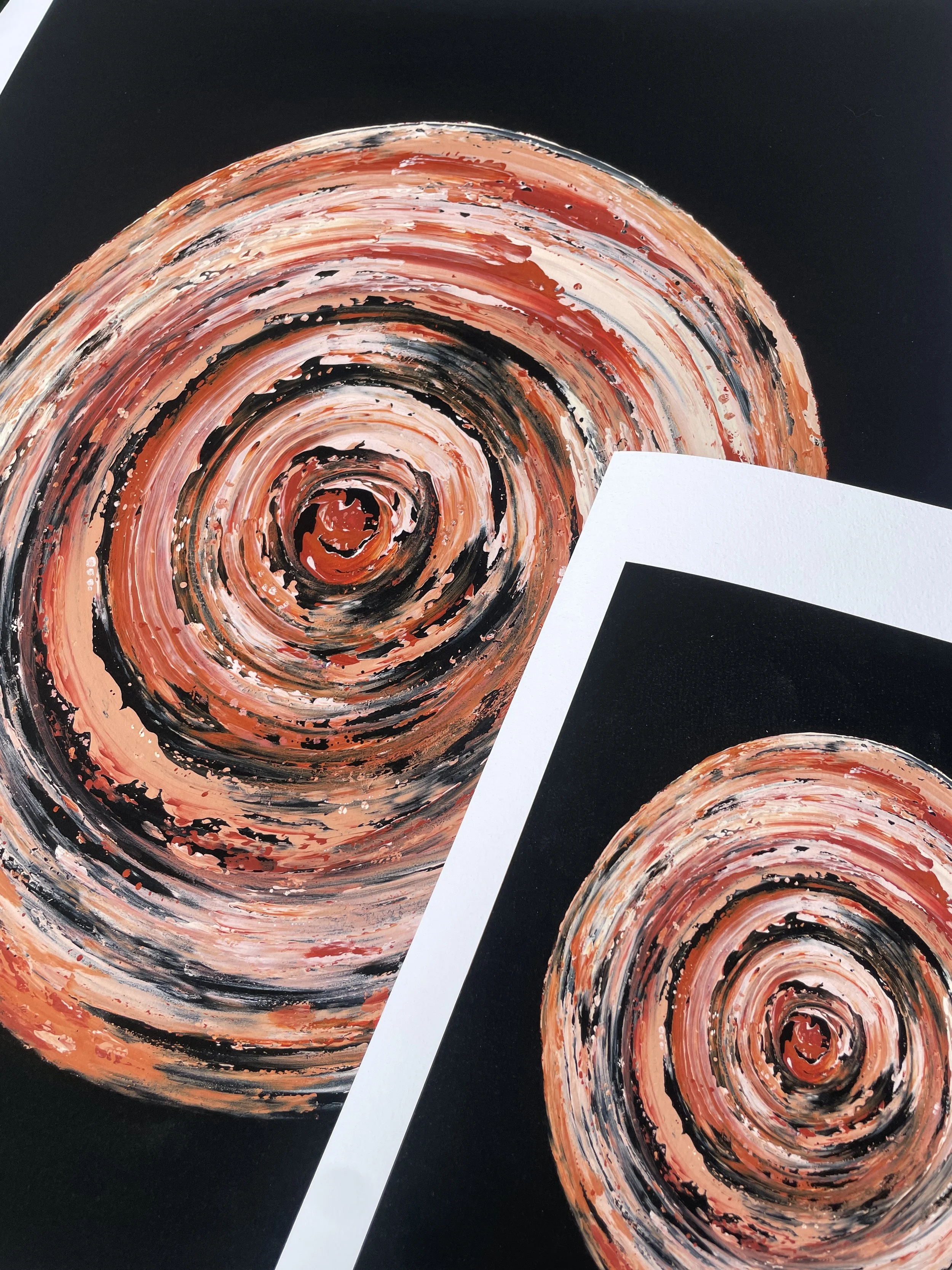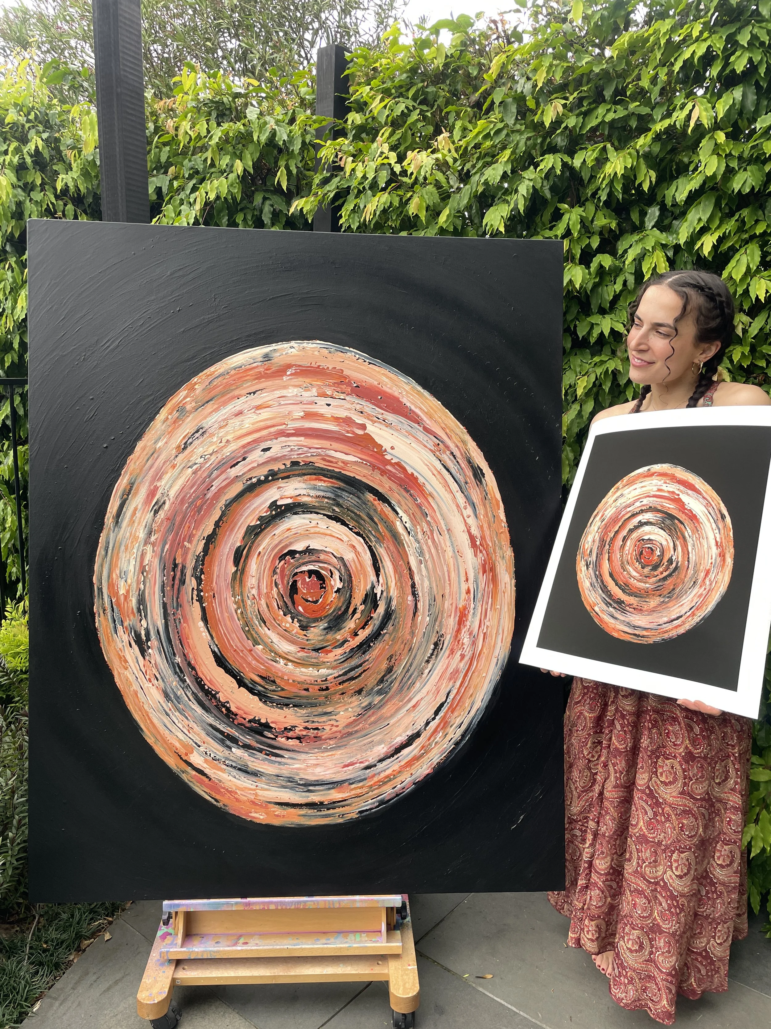A bold and intimate celebration of womanhood, "Primal Mother" honours the raw power, resilience, and creativity that defines the feminine spirit. This deeply personal piece, painted entirely by hand, connects the physical act of creation with the spiritual force inherent in every woman.