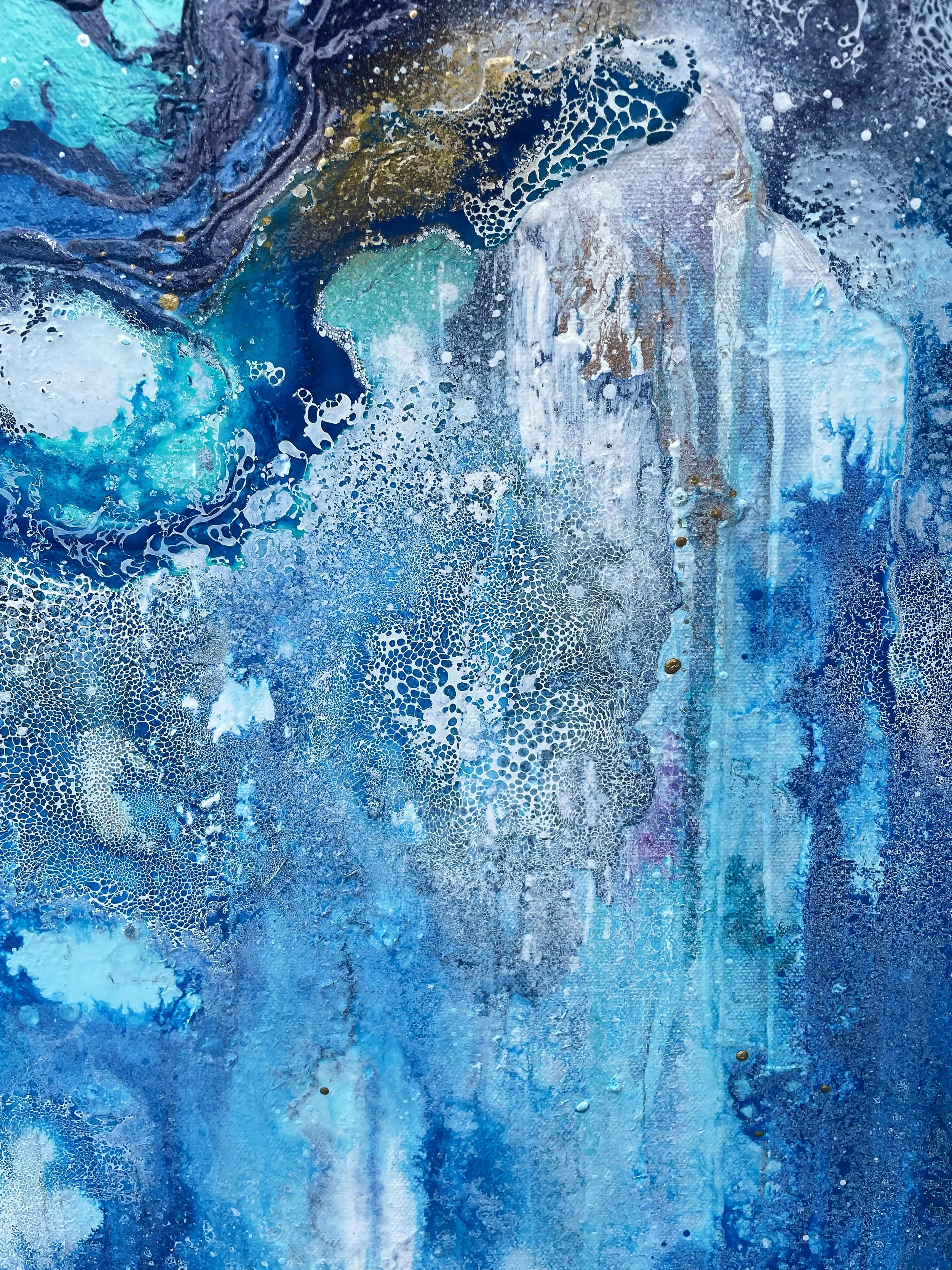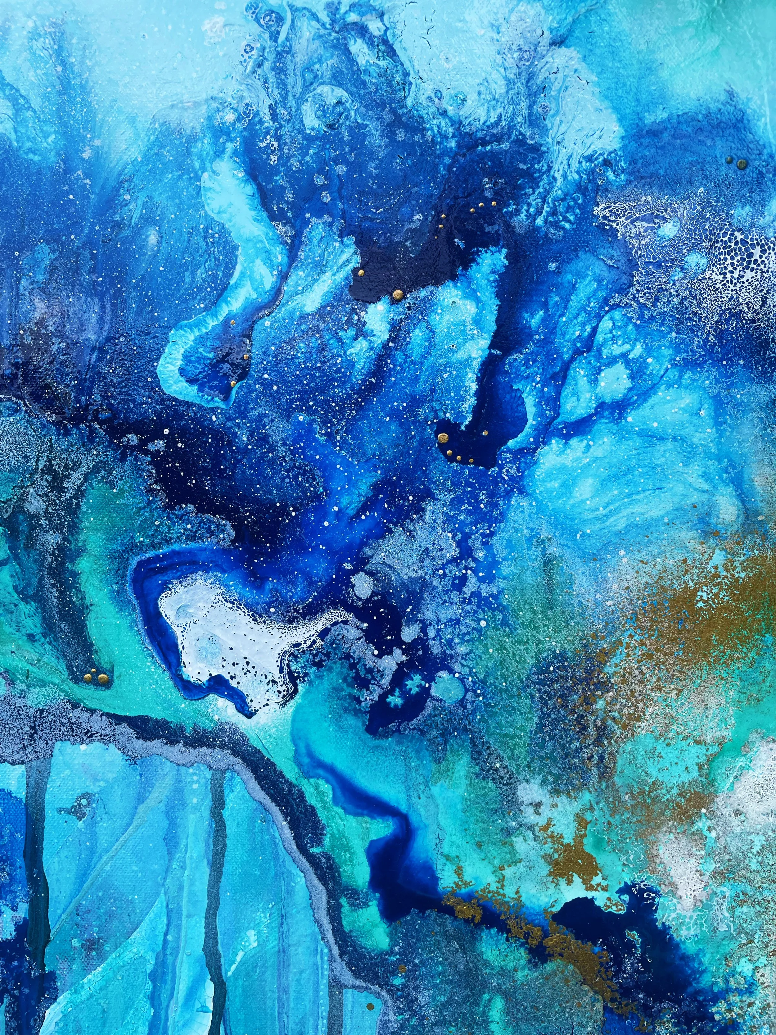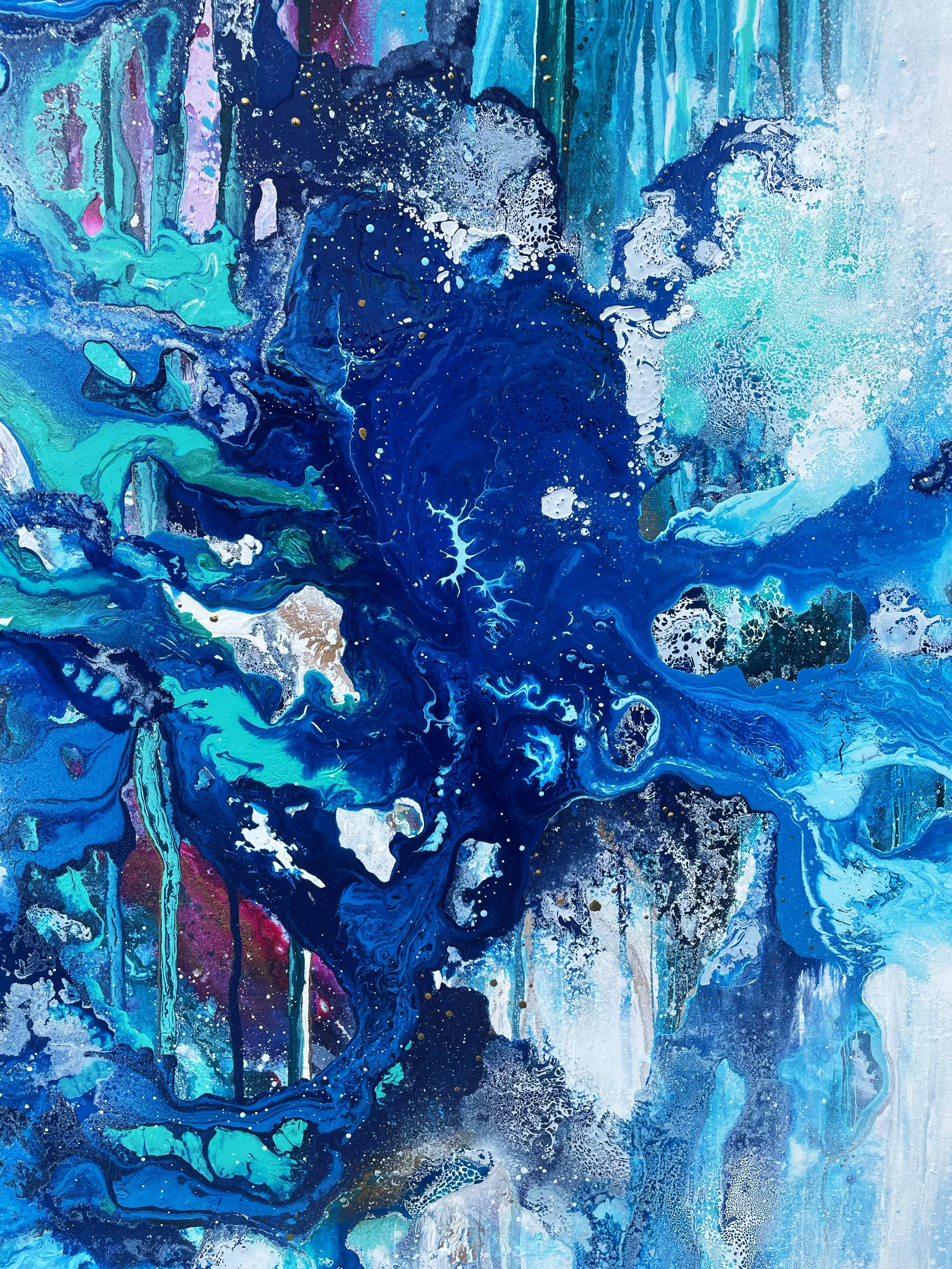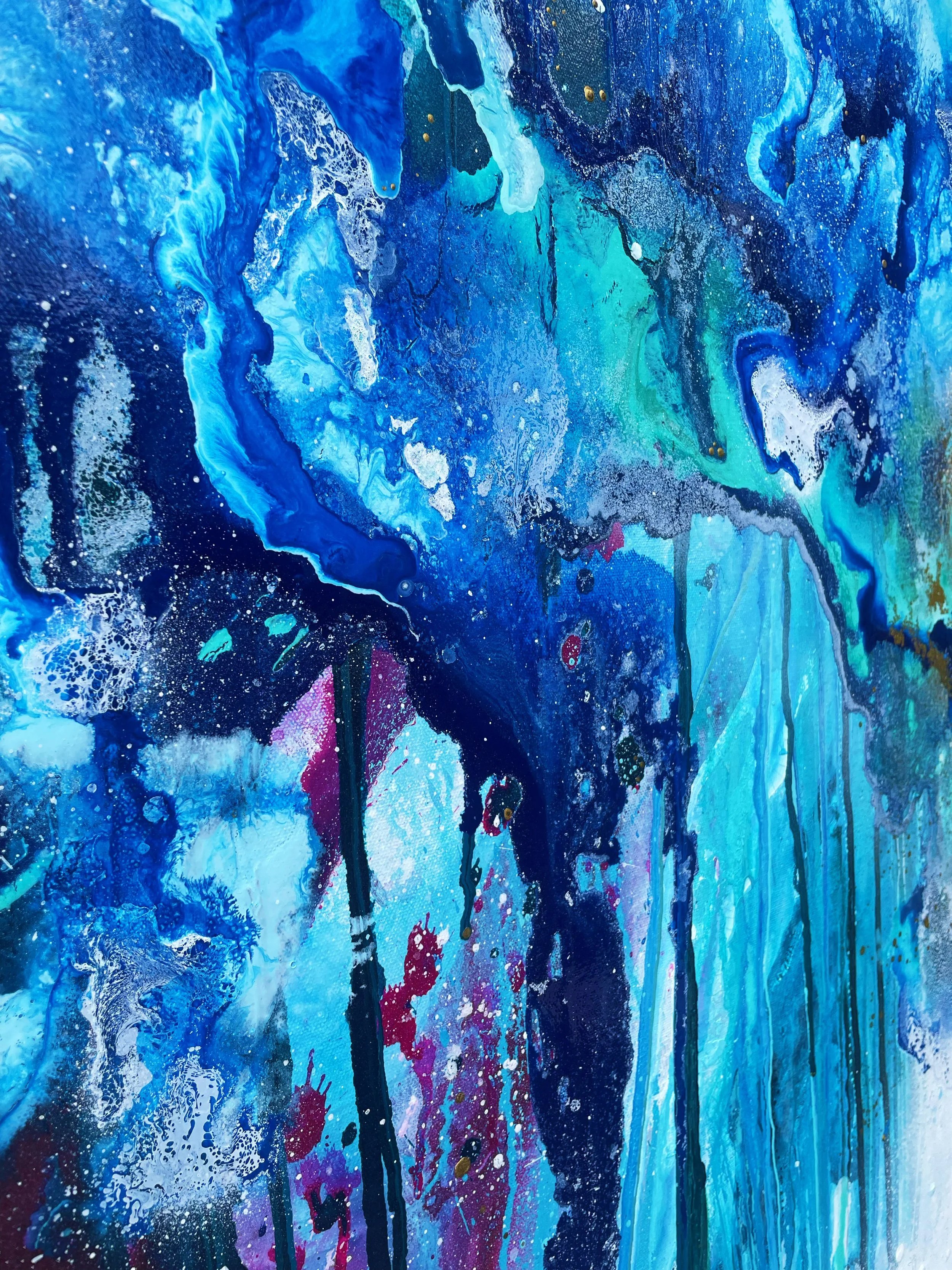 The creation of this piece was an exciting challenge, using the techniques and methods of previous paintings and taking inspiration from some of my oldest pieces. I wanted the painting to create the impression you were moving towards a portal into another world, stepping through a waterfall of layers to eventually reach the light. I wanted to incorporate lots of detail so when you look at the piece as a whole it stands strong in the boldness of colours and shapes. As you move closer you will notice the different elements in the artwork.
