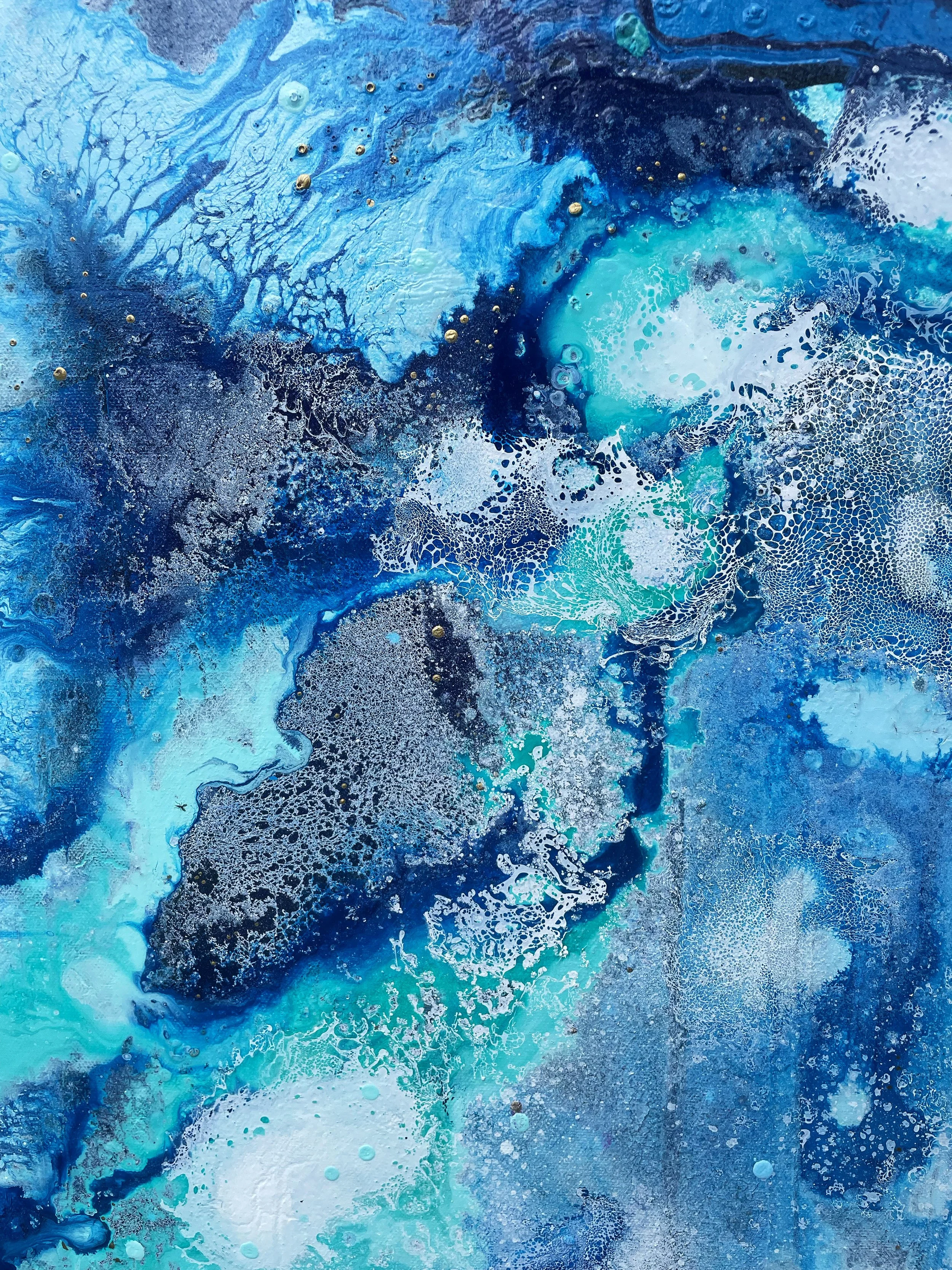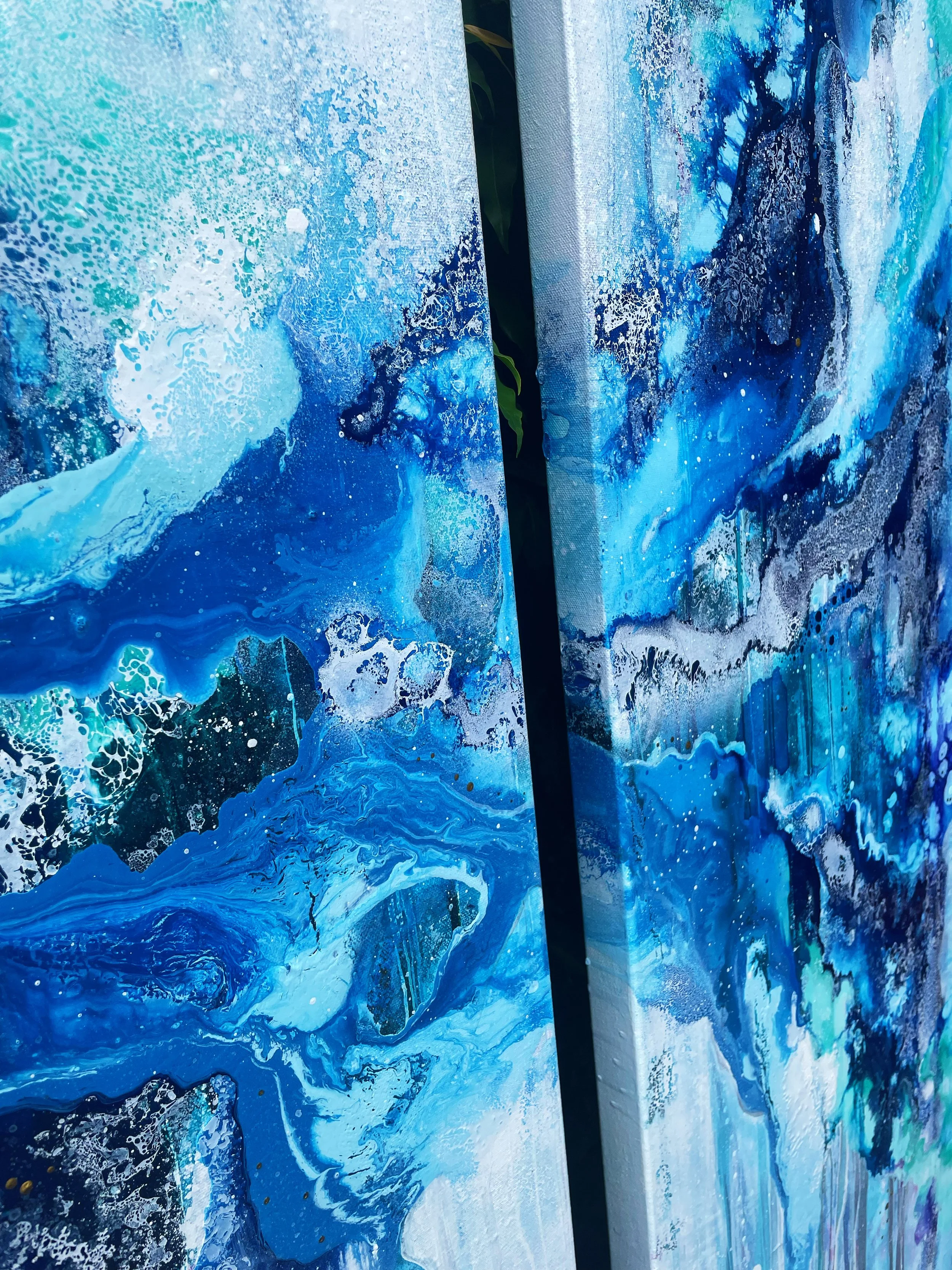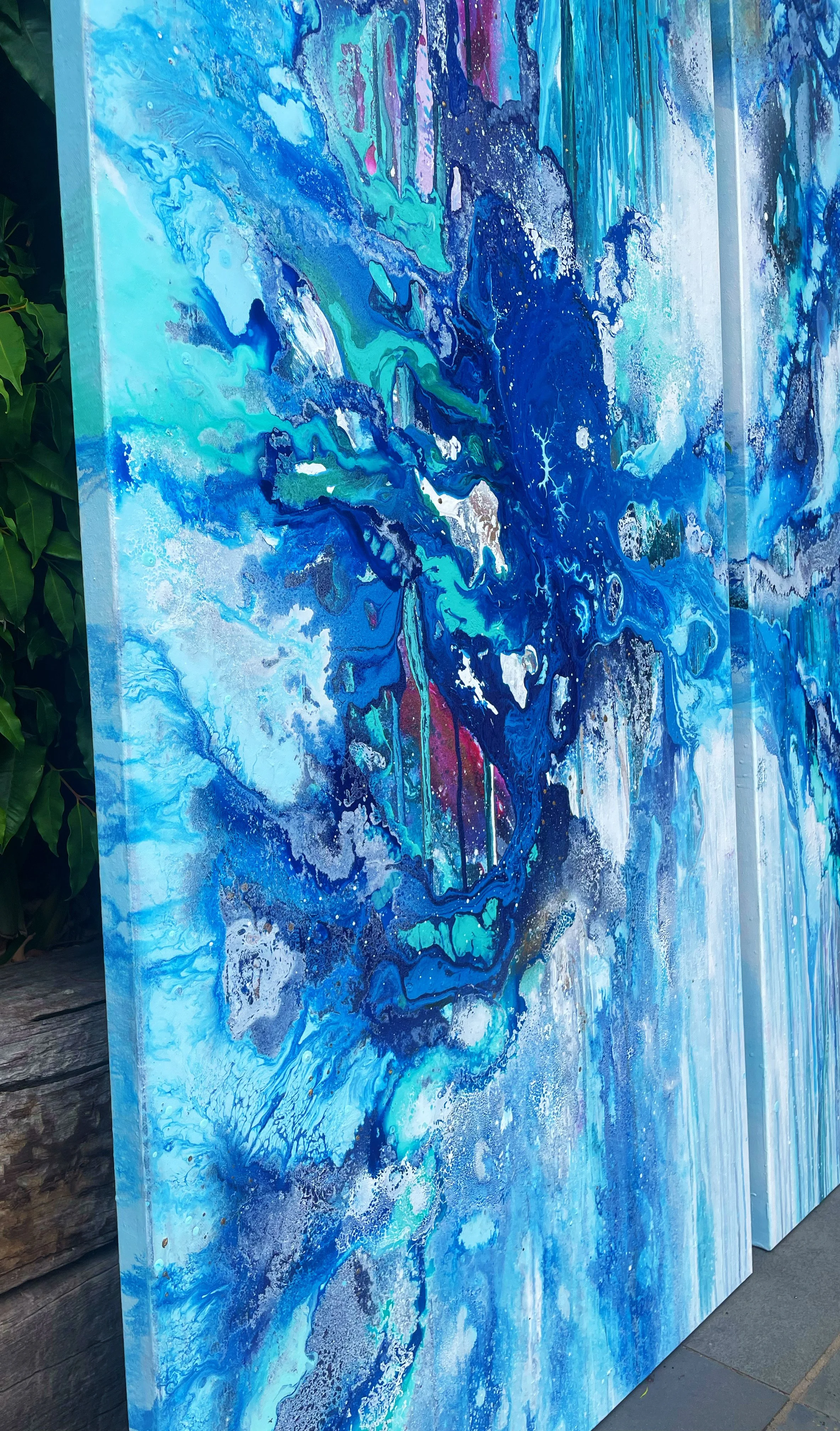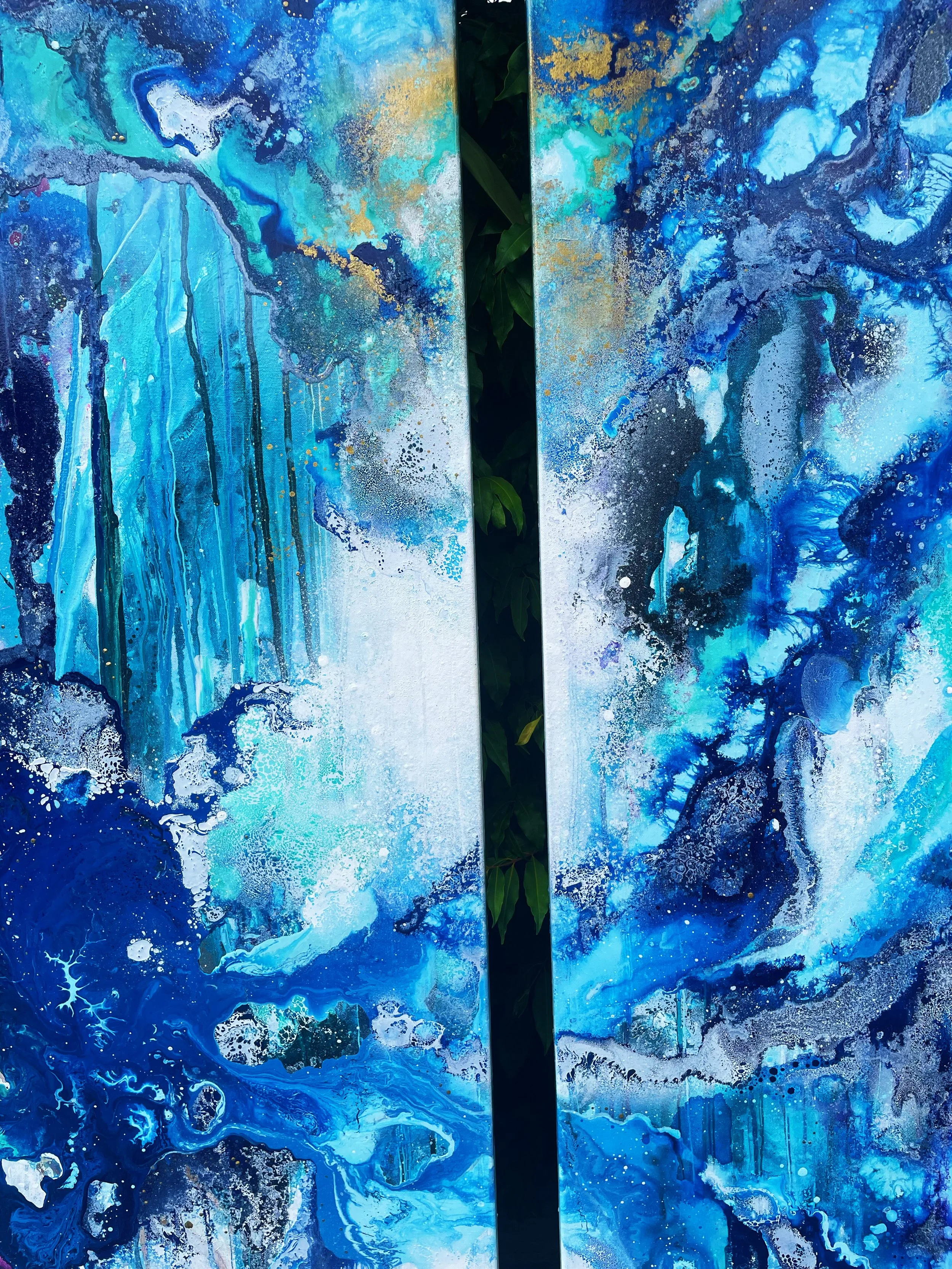The creation of this piece was an exciting challenge, using the techniques and methods of previous paintings and taking inspiration from some of my oldest pieces. I wanted the painting to create the impression you were moving towards a portal into another world, stepping through a waterfall of layers to eventually reach the light. I wanted to incorporate lots of detail so when you look at the piece as a whole it stands strong in the boldness of colours and shapes. As you move closer you will notice the different elements in the artwork.