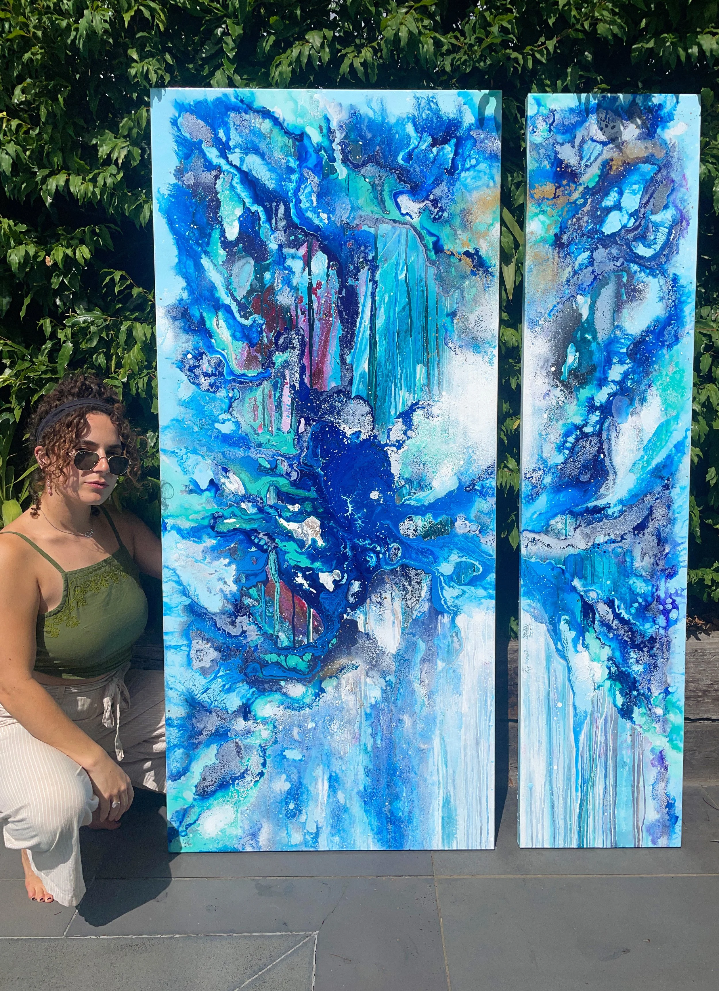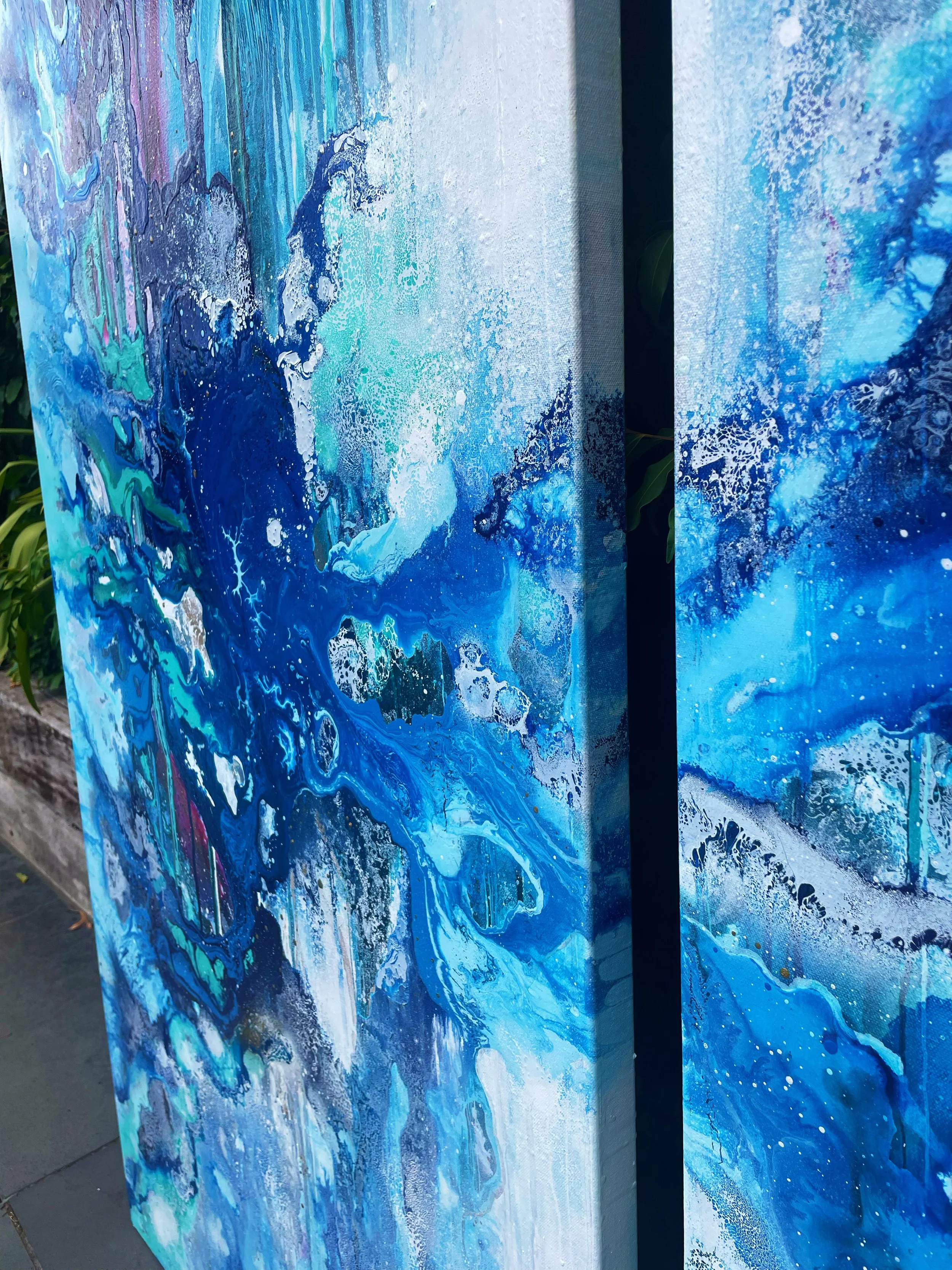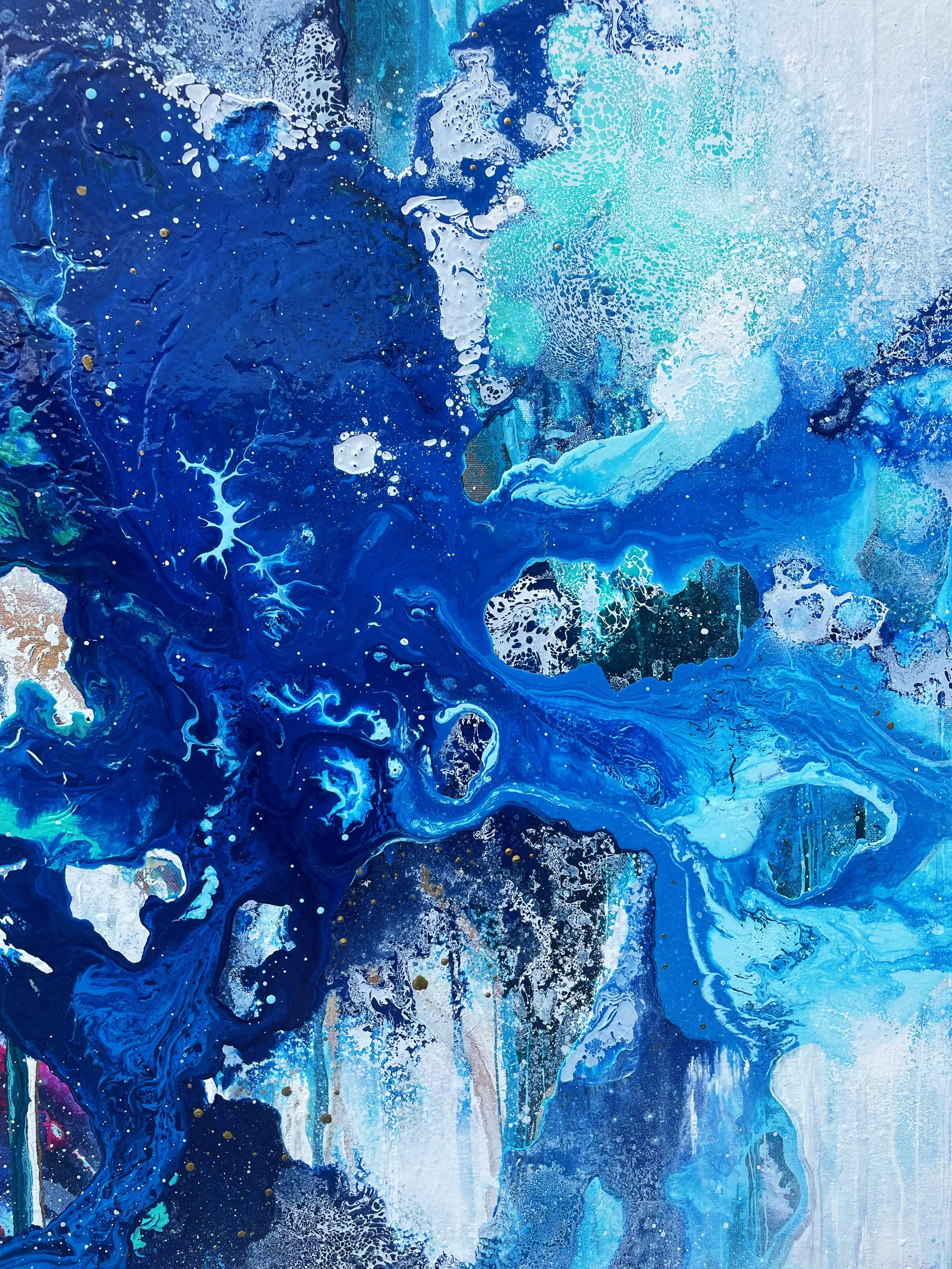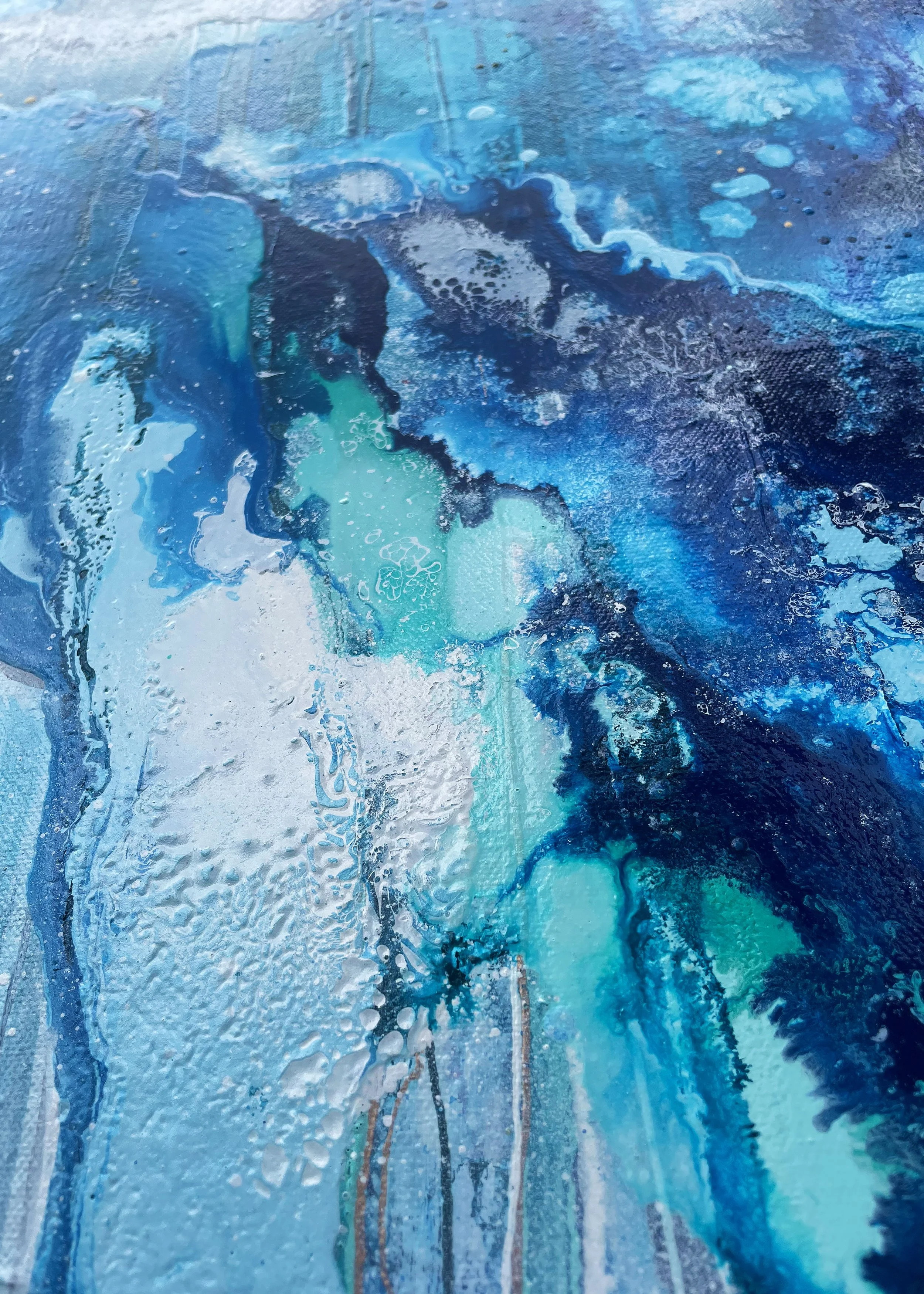The creation of this piece was an exciting challenge, using the techniques and methods of previous paintings and taking inspiration from some of my oldest pieces. I wanted the painting to create the impression you were moving towards a portal into another world, stepping through a waterfall of layers to eventually reach the light. I wanted to incorporate lots of detail so when you look at the piece as a whole it stands strong in the boldness of colours and shapes. As you move closer you will notice the different elements in the artwork.